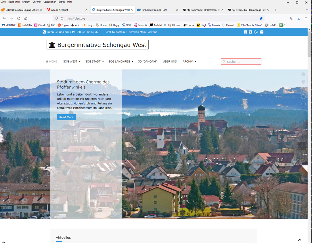 Auftraggeber: "Bürgerinitiative Schongau West", 86956 Schongau Aufgabenbeschreibung: - Konzeption, Entwicklung und Realisierung - Erstellung der Website - Photoarbeiten, Layout - Gästebuch - Implementierung Video https://www.bisw.org/ |